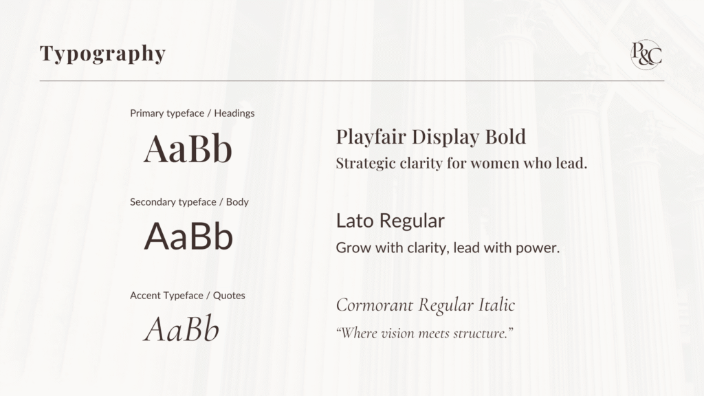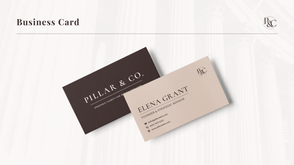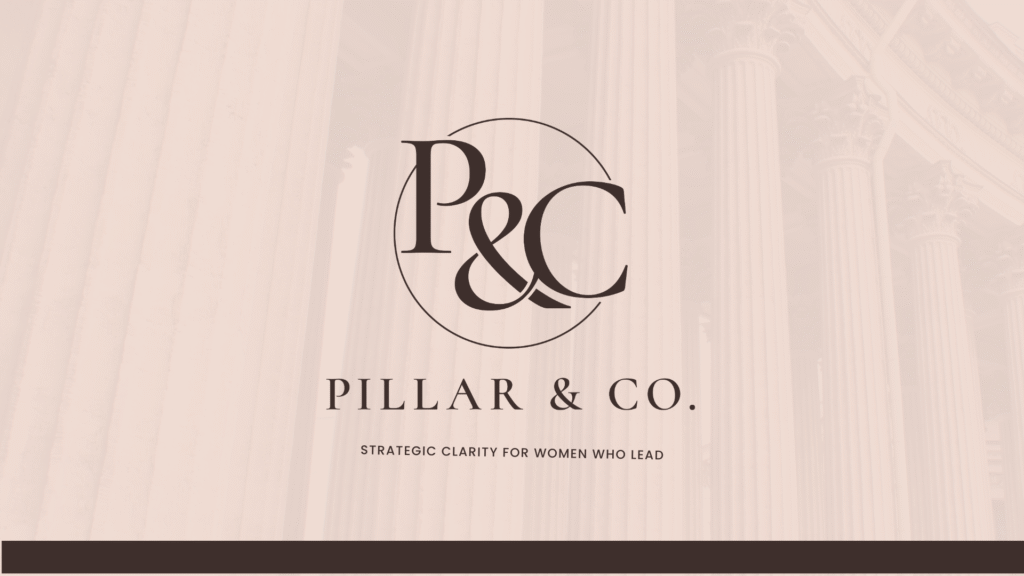 Pillar & Co. was envisioned as a consulting brand that blends professionalism with warmth. We created a circle logotype to represent unity and focus, supported by a palette of blush, ivory, espresso, and muted gold for a premium yet approachable feel. Serif and sans serif type pairings added contrast, giving the brand a polished but human presence.