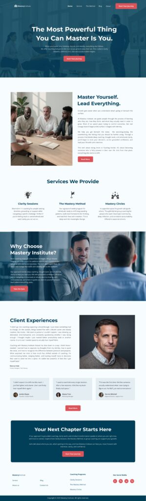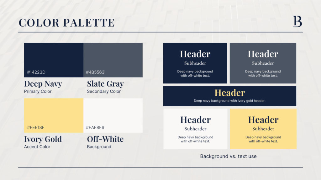 Bennett Leadership Studio’s brand identity was crafted to reflect authority with refinement. Deep navy, ivory gold, and slate accents were combined with elegant serif typography, giving the brand a bold yet sophisticated look that builds trust and communicates leadership strength.