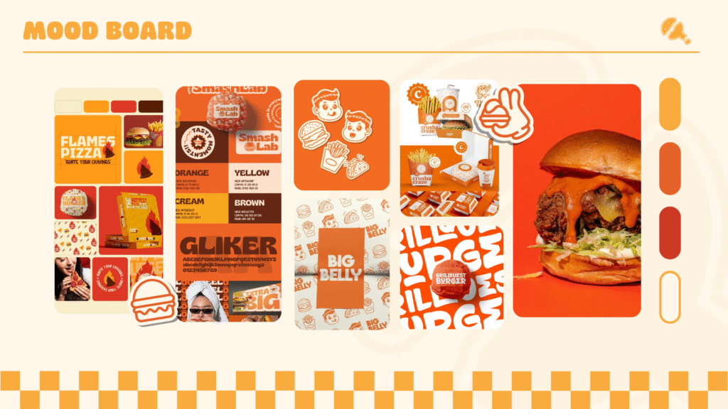 We designed Burger Lab with a bold, playful identity that reflects its love for experimenting with flavors. The burger-flask logo, paired with vibrant oranges and reds, creates a fun yet striking look. Rounded typography adds friendliness and ensures readability across packaging, menus, and social media.