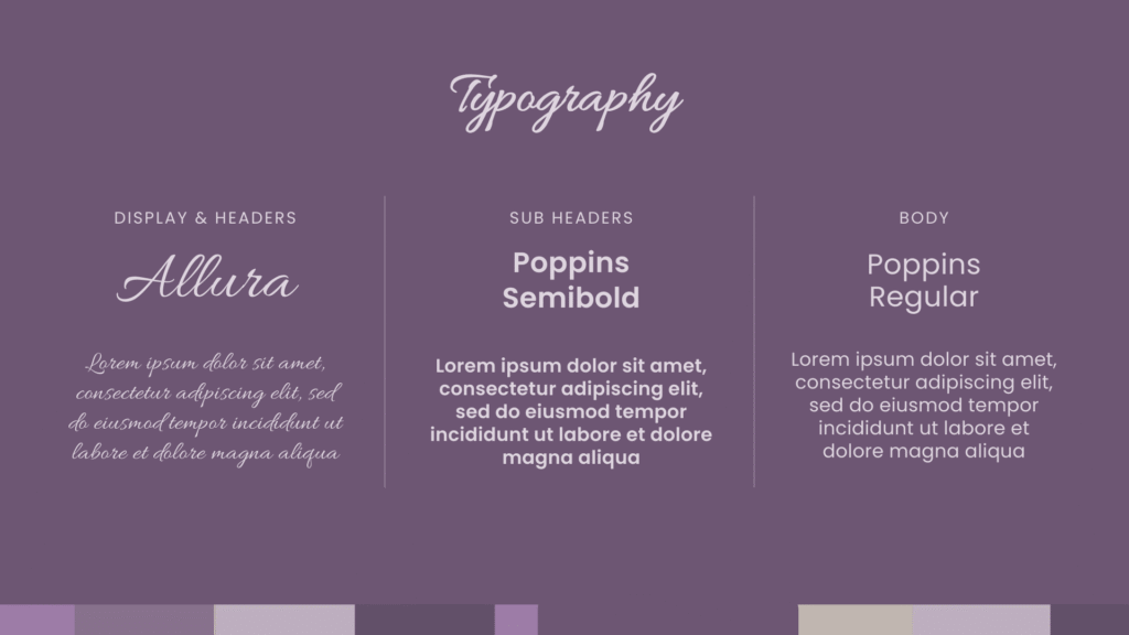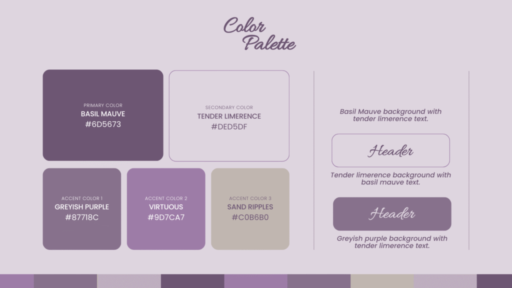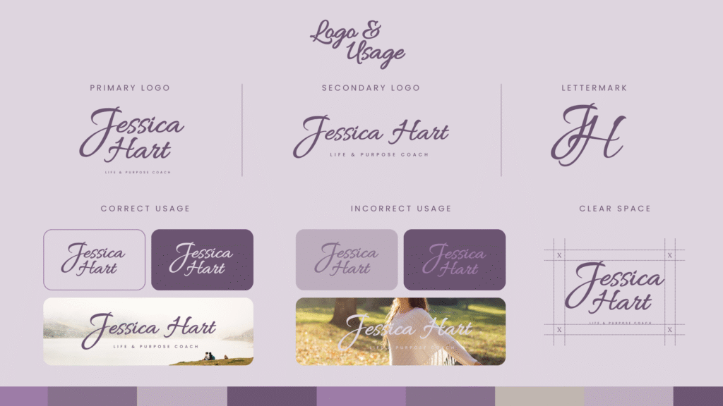 Jessica Hart’s coaching brand needed visuals that felt soft, warm, and intentional. We introduced a flowing script logo for a personal touch, paired it with muted purples to create calm and trust, and set guidelines to keep everything consistent.